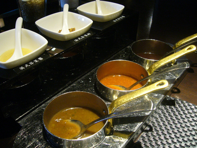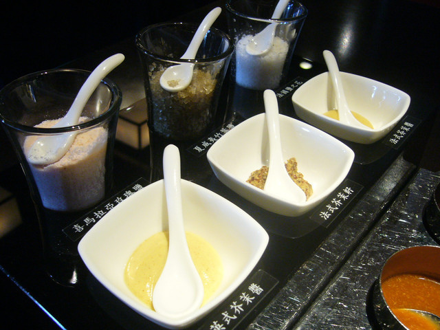 風味飽滿,保證讓人吮指回味,而一字排開的3款牛排沾醬、3款海鹽、3款芥末醬