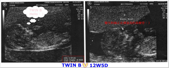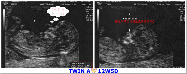 超音波醫生非常仔細的從寶寶們的頭圍、鼻梁骨角度、手臂和大腿骨長度、腦部發育狀況、